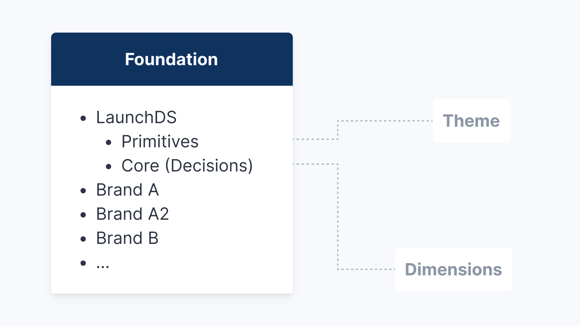 Decoupled logic for maximum scale: Foundation (Brand), Theme (Context), and Dimensions (Device).